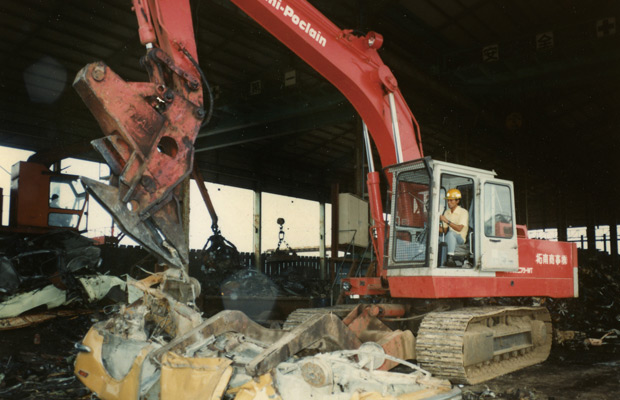 油谷重工(株)開發(fā)的 首臺(tái)日本國產(chǎn)裝載固定式切割機(jī)的 汽車解體機(jī)上市